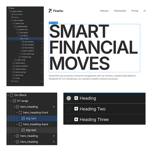In other sections (like REAL-TIME FINANCIAL ANALYTICS), the heading animation is different — it uses only one animation that triggers as you scroll.You don’t need to adjust any delays here.Just select the Heading Component and replace the text as shown in the example.